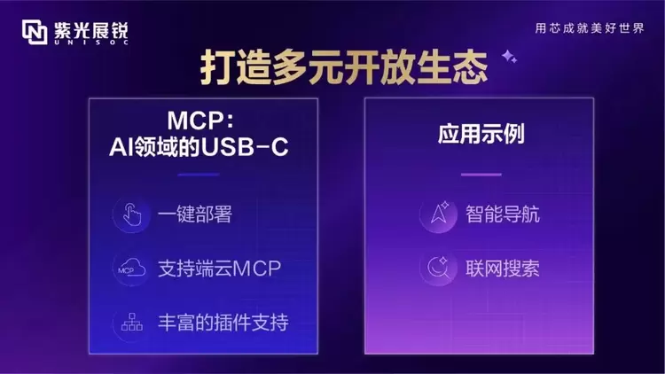 UNISOC 端侧AI平台化解决方案支持AI领域的“万能接口”——MCP,可实现一键部署,支持动态MCP配置、多协议兼容以及端云MCP,可稳定调用外部工具,丰富的插件支持、广泛的服务定制以及快速的应用扩展可助力打造开放多元的协作生态。