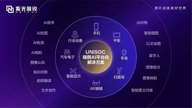 UNISOC AI平台可支持大模型、多模态、多并发、AI Agent、端云结合的多重解决方案,实现AI 绘图、AI语音聊天、AI智能搜图、AI智能图文问答、AI相机、AI翻译等丰富功能。UNISOC 端侧AI平台化解决方案可与手机、平板、穿戴、汽车等多种创新终端灵活组合,赋能千行百业。目前,搭载紫光展锐T9100的步步高AI学习机等多款终端应用已量产上市。