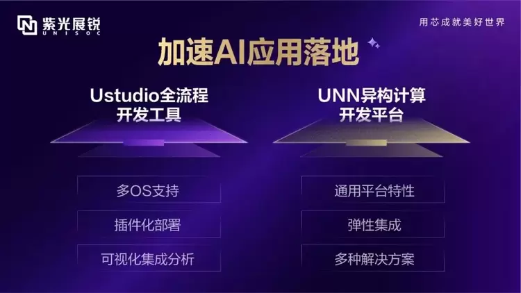 紫光展锐自研的AISDK可提供Ustudio全流程开发工具,多OS支持,实现可视化集成分析、一键安装与插件化部署;UNN异构计算开发平台具备弹性集成与通用平台特性,可提供多种解决方案,降低开发门槛提升开发效率,全方位加速AI应用落地。