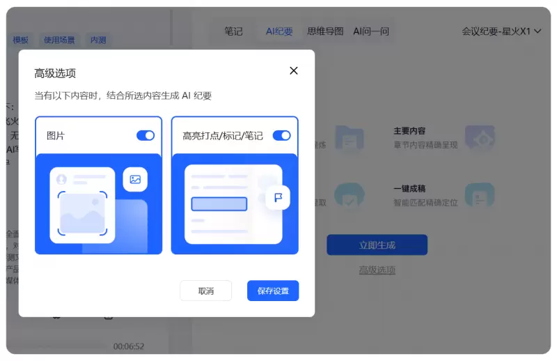 开会时,用户通过笔记、标记、高亮打点等形式记录下重点内容,会议结束后,在AI纪要里通过高级选项,选择默认将以上内容与语音记录内容融合生成AI纪要,即能生成一份专属于你的“定制版”会议纪要内容。