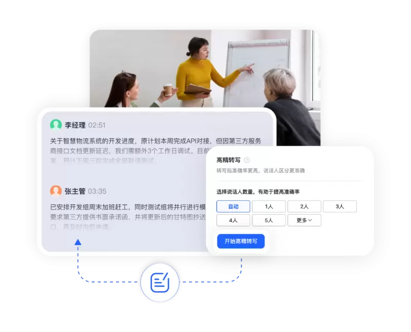 全新讯飞语音转写引擎深度优化声纹特征识别能力,尤其在多人交叉讨论、即兴发言场景中,自动精准区分不同发言人身份精准度更高,并支持用户自定义命名说话人身份。这一功能让会议记录脉络清晰可溯,责任归属明确,回溯讨论过程时无需手动标注,大幅提升复盘效率,为团队协作提供更有序的记录支持,堪称高效的 AI 语音助手。