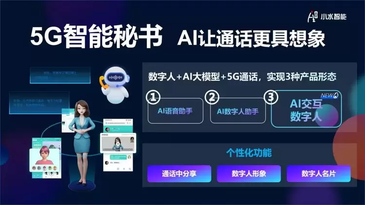 这款让国际评委侧目的产品,并不是传统意义上的通话助手,小水智能5G智能秘书是一款融合5G新通话、AI大模型与数字人技术的智能产品,其三大产品形态——AI语音助手、AI数字人助手、AI交互数字人,覆盖个人生活、企业服务、电商办公等全场景,彻底颠覆传统通话体验!