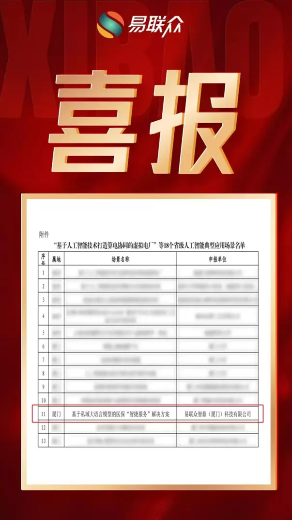 近日,福建省工业和信息化厅正式公布省级人工智能典型应用场景名单。易联众集团旗下易联众智鼎(厦门)科技有限公司的《基于私域大语言模型的医保“智捷服务”解决方案》成功入选。