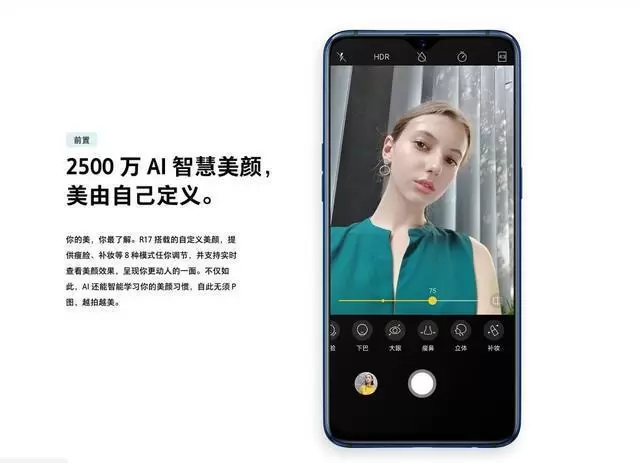 自拍方面,此次OPPOR17自拍功能无与伦比,新增立体自定义美颜功能,用户只需要打开自拍界面,便可以进行8项五官调节,也就是磨皮、瘦脸、小脸、下巴、大眼、瘦鼻、补妆、立体,效果妙出,不满意可以取消,随时美颜,美出新天地。此外,OPPO R17还可以不断学习大数据与用户使用习惯,用它来找出用户的最极致的照片滤镜等,智能记忆,电影大片随手拍!