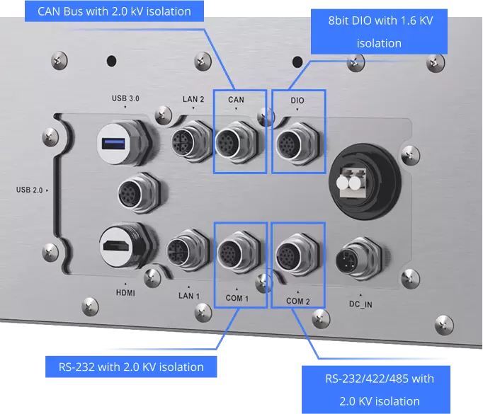 1x RS-232 (2.0 kV隔离)、1x RS-232/422/485 (2.0 kV隔离)、1x CAN-bus (2.0 kV隔离)、1 x GPIO (1.6 kV 隔离),轻松对接PLC、传感器、执行器等设备,抗干扰能力强,通信更可靠。