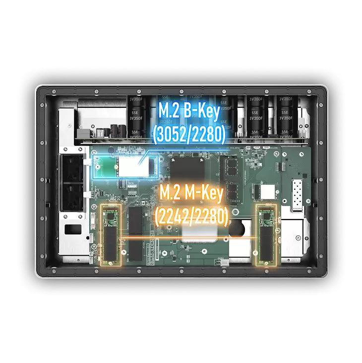 预留M.2扩展插槽,可升级SSD、蜂窝通信或AI加速卡,硬件投资可随业务演进。