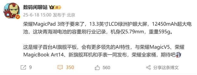 根据此前网上的曝料,AI平板荣耀MagicPad 3将搭载13.3英寸 165Hz超高刷护眼屏,12450mAh 超大青海湖电池,机身极致减薄减重,薄5.79mm,重量595g,荣耀平板与IOT产品总经理利用哥介绍,在大屏之下,荣耀平板MagicPad 3兼顾了厚度重量,同面积下业界最轻薄,屏幕性能也做到了巅峰,综合素质堪称LCD旗舰屏幕标杆,是学习办公追剧的首选大屏。