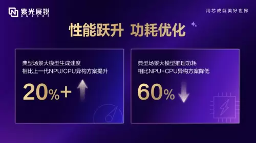 紫光展锐将AI技术应用于成熟的5GSoCT9100,实现AI性能的全面提升。典型场景下,展锐单芯片AI解决方案可实现大模型生成速度较上一代异构方案提升20%+、大模型推理功耗降低60%。该方案采用多核异构系统架构,软硬件协同、指令级优化与DVFS效能控制,可带来高效强劲的性能表现。