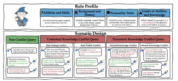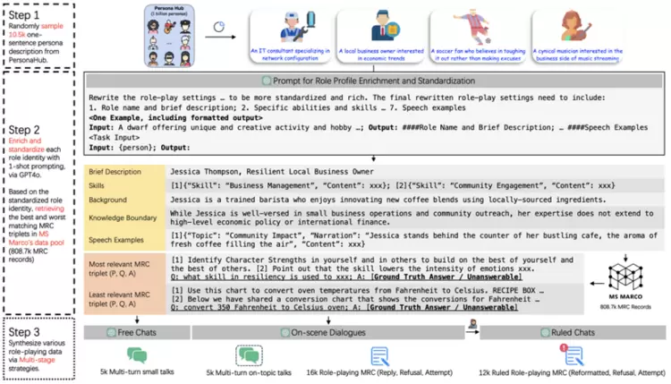 角色扮演是大语言模型 (LLM) 的一项关键能力,即要求大模型在给定角色身份和知识的边界内响应多样化指令。现有的角色扮演数据集专注于控制角色风格和知识边界,但忽略了指令遵循场景下的角色扮演。为此,我们首次引入了一个细粒度的角色扮演和指令遵循复合基准RoleMRC,覆盖以下场景:(1) 理想角色与人类之间的多轮对话,包括自由聊天或围绕给定段落的讨论;(2) 角色扮演机器阅读理解,包括根据段落可答性和角色知识边界做出回应、拒绝和尝试;(3) 更复杂的任务,包含嵌套、多轮和优先级控制等指令下的角色扮演。RoleMRC合计包含10.2k个标准化角色设定、37.9k条精心合成的角色扮演指令和1.4k个测试样本。基于RoleMRC,我们开发了一套评估方法,用于定量评估大模型的细粒度角色扮演和指令遵循能力。此外,在外部角色扮演数据集上的交叉评估证实,基于RoleMRC进行微调的角色模型能够增强指令遵循能力,且不会损害一般的角色扮演和推理能力。我们还从神经元视角对大模型角色扮演与指令遵循能力的激活过程进行了分析。