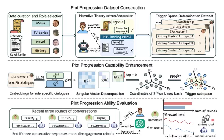 作为一种新的对话方式,角色扮演智能体(RPAs)正受到愈发广泛的关注。到目前为止,对RPAs的研究主要集中于对角色能力和风格的刻画上,而我们从用户使用的角度出发,发现在对话中提升模型对情节的推进能力,能够带来更加具有吸引力的交互体验。为此,我们提出了RolePlot框架,用于专门评估和提升RPAs的情节推进能力。该框架的创新性体现在三个方面:首先,我们构建了基于文学剧本的人工标注和经过验证的合成数据;其次,我们利用大语言模型(LLMs)参数化的embedding,通过检测适合触发剧情推进的子空间,来精准识别对话中可能引发情节转折的关键片段;最后,当检测到用户输入与剧情推进子空间匹配时,系统会主动提示RPAs在对话中推进情节发展。在评估阶段,我们通过模拟用户和RPAs的交互场景,重点通过两个核心指标来评价:对话持久性(对话持续轮次)和用户兴奋度变化。实验结果表明,本方法不仅显著提高了RPAs把握情节转折时机的精准度,更重要的是使用户和RPAs的平均对话轮次大幅增加,同时能持续维持更高水平的用户兴奋度。这有力证明了我们的方法能有效提升用户的沉浸式交互体验。