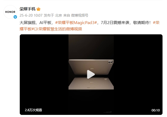 AI平板,大有不同 最佳AI平板荣耀MagicPad 3定档7月2日