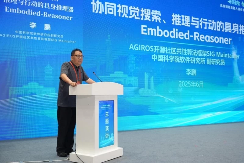 AGIROS社区共性算法框架SIG Maintainer,中国科学院软件研究所副研究员李鹏介绍了协同视觉搜索、推理与行动的具身推理器Embodied-Reasoner。该成果致力于解决交互式长程具身任务编排问题,通过多模态大模型实现协同视觉搜索、推理与行动。经评测,Embodied-Reasoner在成功率、搜索效率、任务完成度三项指标上显著优于参数量更大的通用多模态模型。