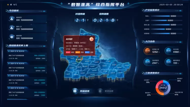 1.实时看板支撑精准决策:云知声数据可视化技术集成人口分布、产业动态、民生诉求等18类核心指标,可为镇党委、政府提供全量数据可视化分析,以“三色户”热力图为例,通过不同颜色清晰标注重点关注人群,助力镇党委、政府精准定位困难家庭,实现政策靶向投放。