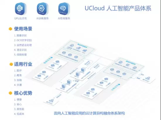 UCloud(优刻得)面向人工智能应用的云计算异构融合体系以CPU 云主机、GPU云主机为基础提供算力平台,以UFile对象存储、UDisk网盘存储、UDB云数据库等多种云储存为存储平台,基于AI在线服务(UAI-Inference)和AI 训练服务(UAI-Train)系统为人工智能领域企业提供一套完整的一站式异构存储、计算人工智能PaaS服务平台。该平台使用领域覆盖图形计算、生命医学、语音识别、智能驾驶学等人工智能领域,全力支撑人工智能计算力升级需求。