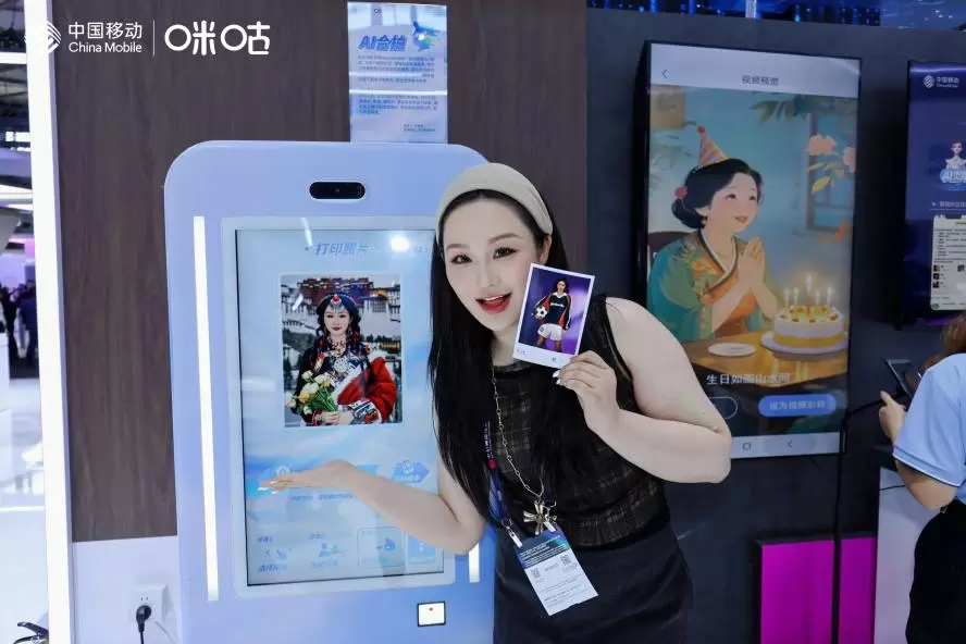 咪咕展区另一侧,AI 合拍一体机携MWC科技感主题模版及 NBA 联名模板升级亮相,以虚实融合影像体验重构文旅合拍生态。用户上传单张照片,AI 即可极速生成定制化作品,无论你是喜欢契合大会氛围的未来科技风,还是偏爱热力四射的篮球运动风,多元主题特色的AI写真模版都能满足你的心愿,全程5分钟,即可收到打印实体照或扫码保存电子档,让影像创作成为即时可分享的数字资产。