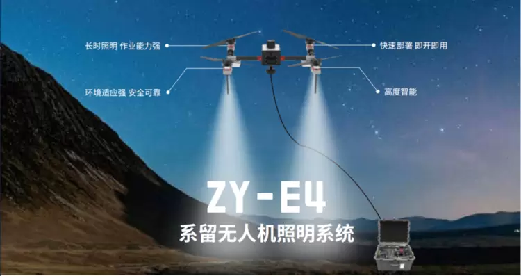 其中,ZY-E4系留多旋翼无人机平台聚焦了全场的关注,其搭载高亮LED灯组、结合智能控制系统,可提供全天候、大范围、高亮度的智能照明,解决了传统照明设备在复杂地形中易倾倒、覆盖范围不足的痛点。