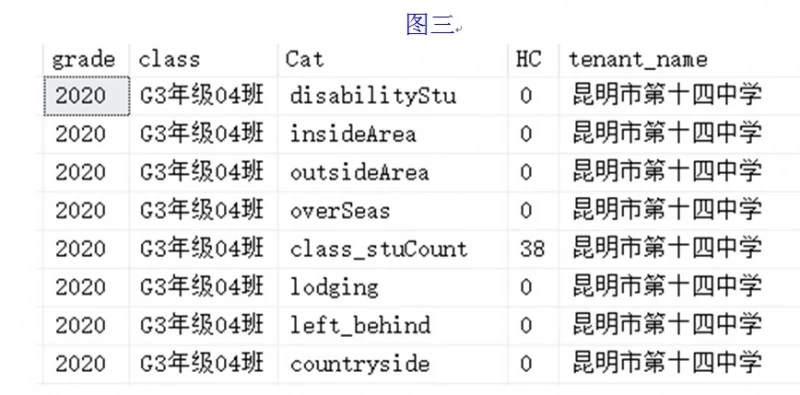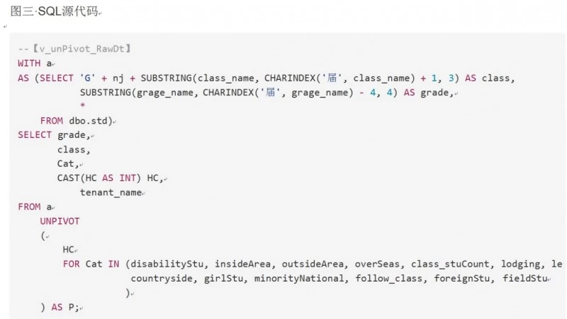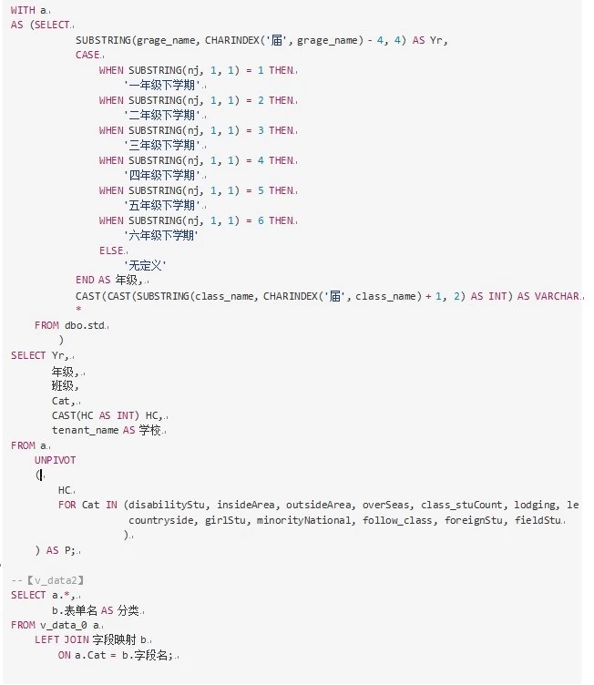 --【v_data_0】WITH aAS (SELECTSUBSTRING(grage_name, CHARINDEX('届', grage_name) - 4, 4) AS Yr, CASEWHEN SUBSTRING(nj, 1, 1) = 1 THEN'一年级下学期'WHEN SUBSTRING(nj, 1, 1) = 2 THEN'二年级下学期'WHEN SUBSTRING(nj, 1, 1) = 3 THEN'三年级下学期'WHEN SUBSTRING(nj, 1, 1) = 4 THEN'四年级下学期'WHEN SUBSTRING(nj, 1, 1) = 5 THEN'五年级下学期'WHEN SUBSTRING(nj, 1, 1) = 6 THEN'六年级下学期' ELSE'无定义' END AS 年级,CAST(CAST(SUBSTRING(class_name, CHARINDEX('届', class_name) + 1, 2) AS INT) AS VARCHAR* FROM dbo.std) SELECT Yr,年级,班级, Cat,CAST(HC AS INT) HC,tenant_name AS 学校FROM aUNPIVOT (HCFOR Cat IN (disabilityStu, insideArea, outsideArea, overSeas, class_stuCount, lodging, le countryside, girlStu, minorityNational, follow_class, foreignStu, fieldStu)) AS P;