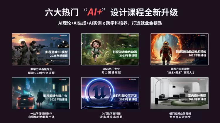 面对2025百万AI人才缺口,火星时代精准定位,聚焦数字创意全产业链需求,升级模型、角色动画、虚幻美术、虚幻开发、剪辑包装、室内设计课程,全面加深AI理论、AI内容生成、AI+传统工作流实操等内容,同时建设AI虚拟现实体验区、3D打印体验区、AI动捕实训室等实训工作坊加强AI项目实训,在火星时代“岗位导向”课程体系的基础上,形成“AI+X”培养模式,针对性培养产业亟需的复合型AI人才,提升学员综合就业竞争力。