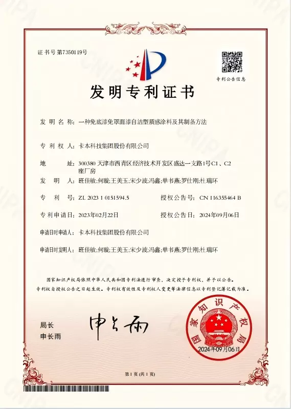 产品性能领先:卡本针对传统质感涂料存在的问题提出了一种创新解决方案——“一种免底漆免罩面漆自洁型质感涂料及其制备方法”,这项技术已正式获得国家发明专利授权(专利号:ZL202310151594.5),同时通过“国际先进”科技成果认定。