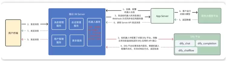 客户可在Dify平台上创建一个自己的AI Agent(如:聊天机器人),同时在融云服务端创建一个机器人,并将该机器人通过配置直接与Dify平台创建的AI Agent进行对接。