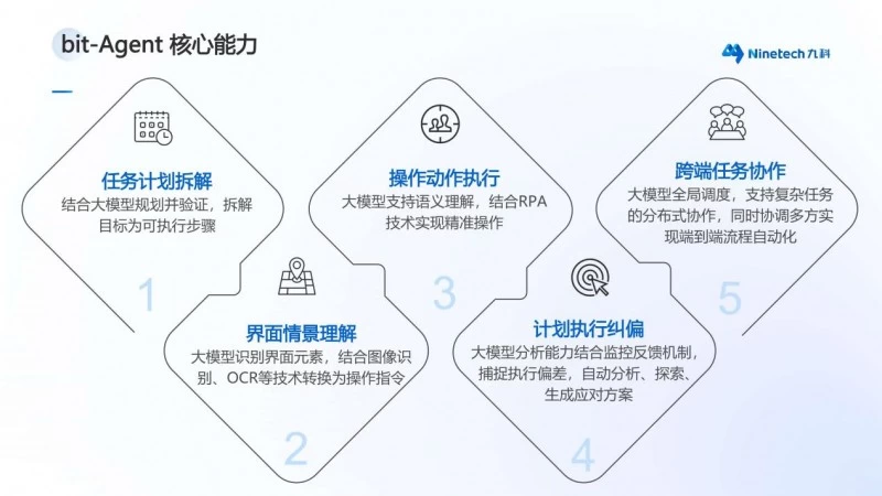 作为2024年国央企RPA市场占有率领先的领军企业,九科信息在图像识别算法与业务流程设计上形成了强大的技术壁垒,并成功将其应用于bit-Agent的研发当中。九科信息曾做过同类产品之间的横向对比测试,在同一任务中,仅有bit-Agent能通过合理的任务规划及精准的界面操作顺利完成任务。