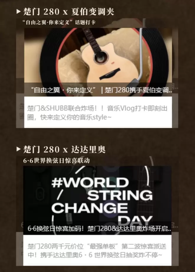 为了让更多人了解楚门280的产品内核,楚门280与夏伯变调夹、达达里奥琴弦进行联动,全网超100位达人参与支持。