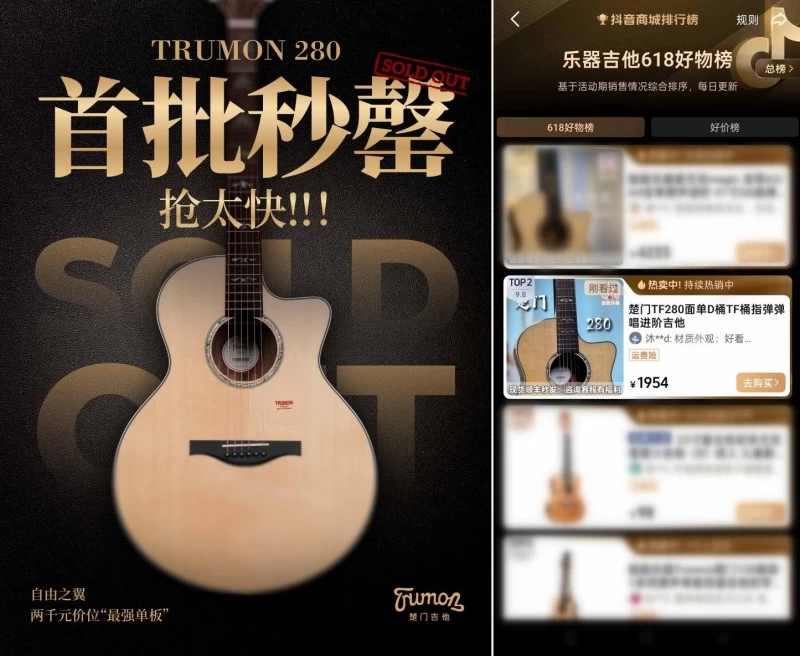 继海豚物语“一豚难求”之后,楚门280在热度与口碑的“双重引爆”下,强势打破了现有两千元价位面单吉他的竞争格局,迅速抢占了市场。在刚结束的抖音618大促中,楚门280荣登抖音“乐器吉他618好物榜”实时第二名,不仅是两千元价位段唯一上榜的爆款新品单板吉他,更成为市场增速最快的吉他单品。