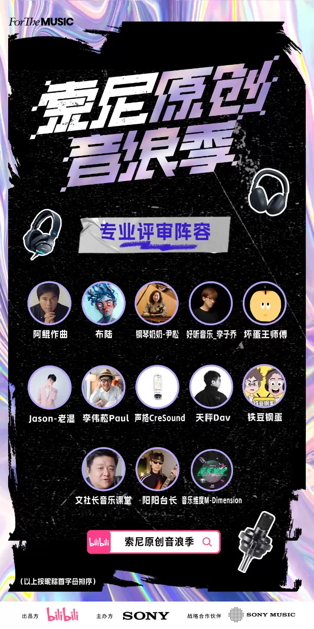 “索尼原创音浪季”面向所有原创音乐作品开放,不限风格。赛事全程设置权威专业评审团,由横跨创作、教育、演奏等多领域的资深音乐人(包括华语乐坛金牌制作人李伟菘Paul、深受欢迎的音乐导师文社长音乐课堂、Jason-老湿、天秤Dav、钢琴奶奶-尹松等)13位评委严格把关,确保评审的专业性与高标准。