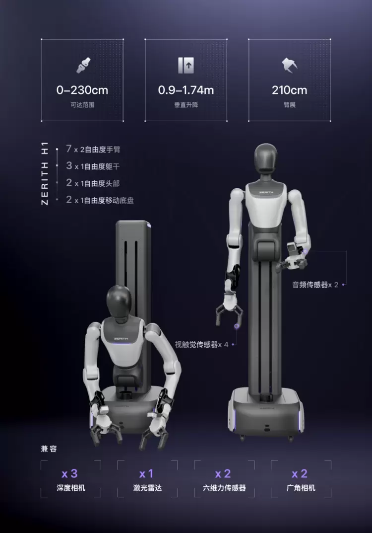 ZERITH-H1采用高度拟人化的上肢结构设计,其关节自由度布局严格参照人体工学,并显著扩展了关节活动范围。特别设计的升降柱式构造有效抬升机身,大幅消除腿部空间占用,最终实现超越成年男性的灵活操作空间。