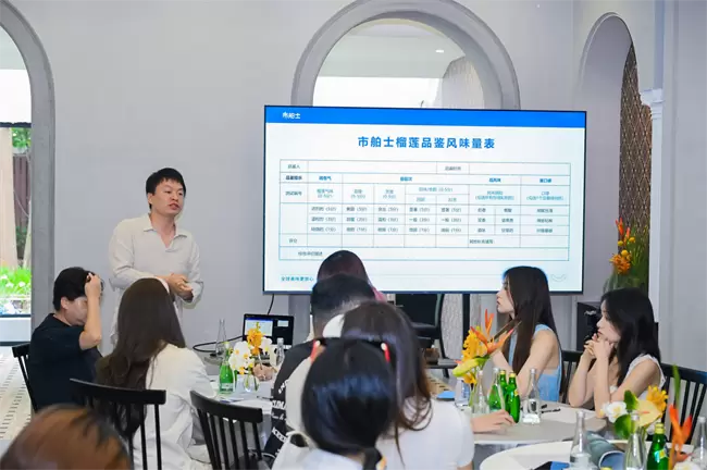 品鉴会上,市舶士展示了 D197 猫山王、D200 黑刺、D198 金凤等近10款马来西亚核心产区名种榴莲。品牌创始人王佳强博士结合产区生态、品种特性、风味分型等维度展开介绍,并系统讲解“闻香气 - 尝层次 - 品风味 - 鉴口感”四步品鉴法,引导嘉宾基于气味浓淡、甜苦平衡、回甘特征等感官指标品尝榴莲,进行风味评分,共创可视化风味量表。