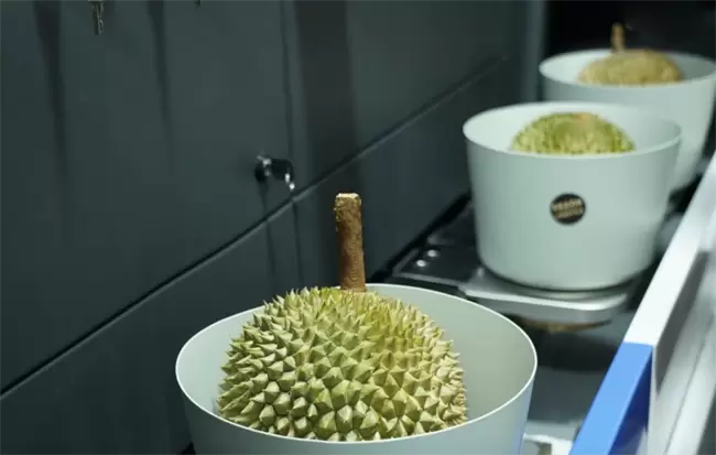 (图为榴莲送入市舶士“榴侦探”3D 无损检测机器进行检测)