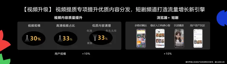 视频生态实施“质”“量”双引擎战略。一方面通过AI技术过滤低质内容,重构纯净高质的内容生态,推动高清视频占比提升33%,整体规模增长30%;另一方面引入精品短剧,凭借高能剧情、沉浸式体验与FA卡片便捷入口撬动流量新增量,目前已免费开放。