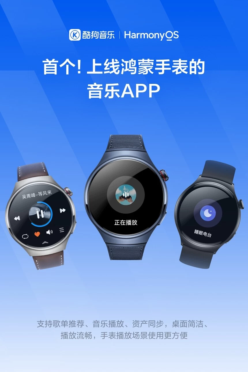 与此同时,大会上还首发了鸿蒙手表端的音乐服务。酷狗音乐作为首个在鸿蒙手表上线的三方应用,针对微型交互场景深度定制极简界面;小屏内高效集成歌单推荐与播放控制,会员权益同步;同时保障播放流畅性,实现音乐在鸿蒙系统上从手腕自由延伸至全场景的跨越。