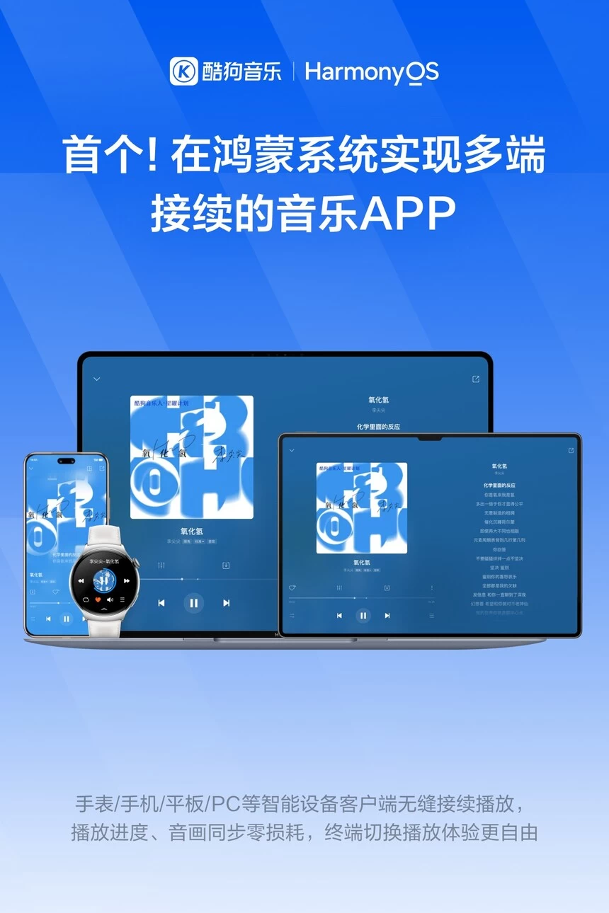 酷狗音乐凭借播放状态跨设备接续能力,在鸿蒙生态中,实现了无论是手机↔ 手机、手机 ↔ 平板,还是手机 ↔ 鸿蒙电脑 等多种设备组合,都能无损接续。多场景多设备全程播放进度同步、音画零延迟中断,为鸿蒙操作系统,带来了更流畅的跨设备音乐体验。该能力基于ArkTS架构开发,成为业内唯一针对鸿蒙操作系统的“可穿戴设备-桌面终端”全链路的音乐解决方案,树立跨端自由体验的全新标杆。