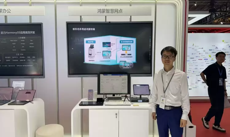 除了引人注目的轻终端设备,赞同科技还在展会上展示了基于纯血鸿蒙系统HarmonyOS 5.0的手机银行产品。该产品深度融合了鸿蒙系统的原生能力,如鸿蒙原子服务等,为用户带来了个性化且直观的服务体验。同样,该产品也依托大语言模型驱动业务办理流程,用户只需用一句话表达自己的需求,AI即可智能地完成一系列业务办理,高效达成用户的最终目的。该手机银行产品的推出,不仅提升了用户的服务体验,更展现了赞同科技在金融数字化方面的深厚积累和创新能力。
