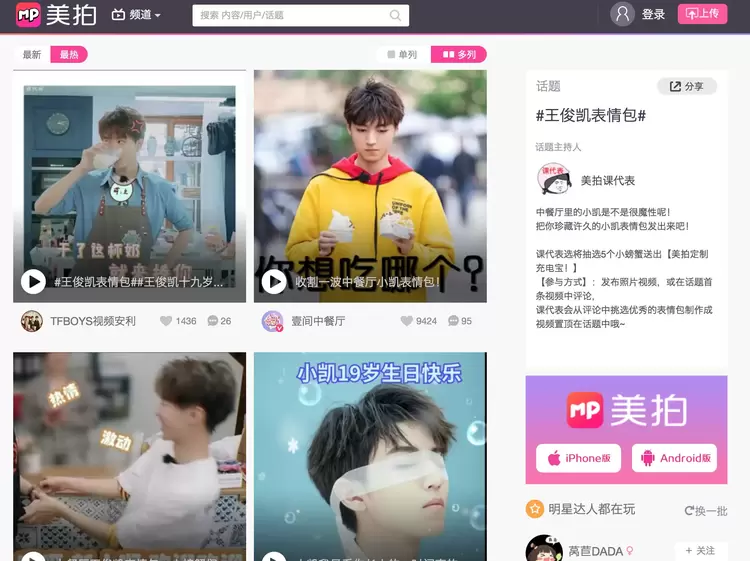 这一连串的魔性表情不仅吸引了一大波路人粉,甚至连美拍也开始助阵。美拍平台发起了#王俊凯表情包#话题,诚邀小螃蟹们在话题中分享珍藏许久的小凯表情包,激发众多美拍用户的创作热情。