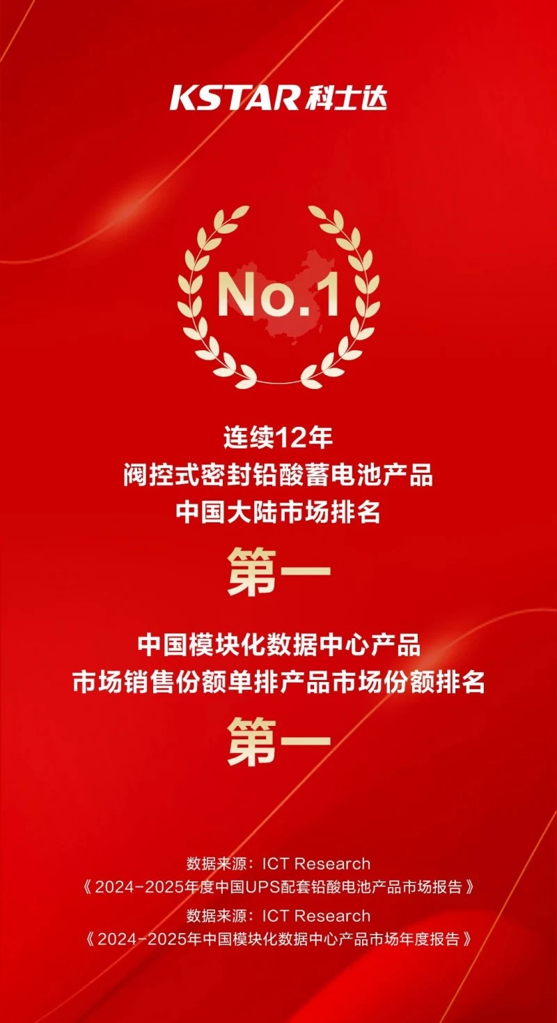 近日,ICT Research权威发布了多项2024年数据中心关键基础设施市场报告,科士达在供配电、模块化架构等核心领域表现卓越,分别斩获:2024-2025年阀控式密封铅酸蓄电池产品在中国大陆市场排名第一;2024-2025年度中国模块化数据中心产品市场销售份额中单排产品市场份额排名第一;双项重量级市场排名,充分彰显其在数据中心深厚技术底蕴与全面领先的市场竞争力。