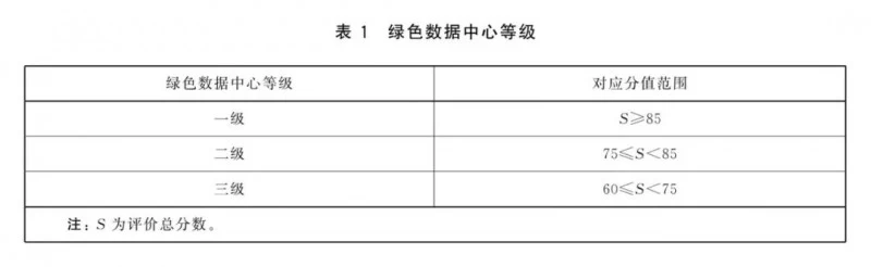 绿色数据中心可划分为三级,一级为最高级,三级为最低级。三个等级的绿色数据中心按评价体系,依据评价方法所得评价总分数的不同进行划分。绿色数据中心等级划分见表1。