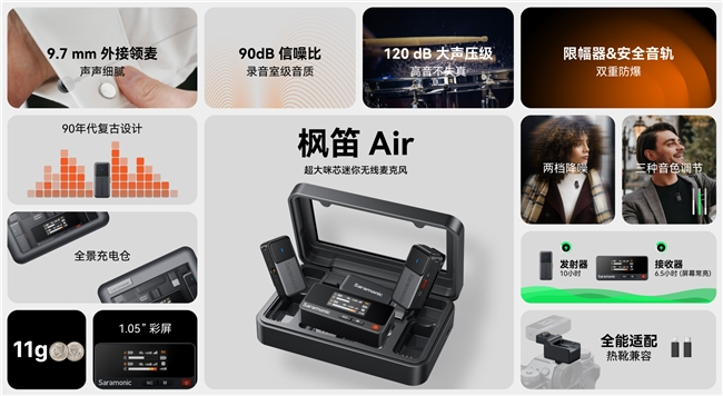 2025年6月25日,全球专业声学设备领军品牌Saramonic枫笛正式面向全球发布旗下全新产品——枫笛Air无线麦克风。枫笛Air以“低调入场,声声尽现”的理念推出这款集“超大咪芯、高信噪比、全场景适配”于一体的匠心之作,以9.7mm超大咪芯、90dB行业领先信噪比与120dB大声压级的硬核参数,打造出市面上超大咪芯的迷你麦克风。