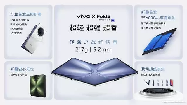 2025年6月25日,vivo正式发布新一代折叠旗舰vivo X Fold5,机身轻至217g,打破了vivo上一代折叠屏X Fold3保持的219g全球最轻纪录,再一次定义大折叠机型轻薄新标准。