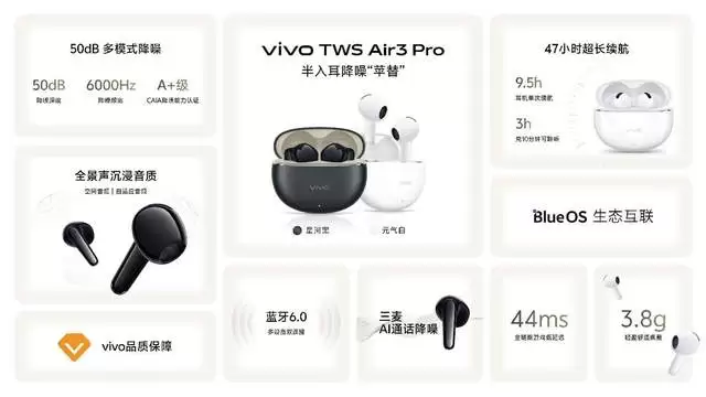 vivo TWS Air3 Pro 今日限量开抢,7 月 2 日正式开售,上市价格 199 元,具有“元气白”和“星河黑”两款配色,单耳机仅重 3.8g,支持 IP54 防尘抗水、至长 47 小时听歌续航(配合耳机盒)、空间音频和 DeepX 3.0 立体声效、44ms 全链路游戏低时延和蓝牙 6.0 多设备双连接,融入 BlueOS 生态,是 vivo 生态的默契拍档。针对续航焦虑的用户,我们还推出了vivo TWS Air3 Pro 长续航版,最长续航可达 52 小时,上市价格 229 元, 7 月 10 日正式开售。