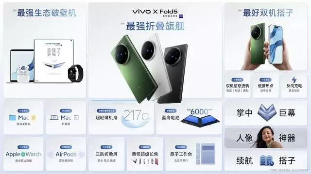 在「全球最轻」基础上,vivo X Fold5体验全面进化,不仅达到了行业领先的IPX8、IPX9防水等级,同时实现了折叠唯一的IPX9+防水能力,还实现了折叠唯一的IP5X防尘和创纪录的-30℃电池正常供电,成为全球首款「三防」折叠屏,树立折叠屏品质新标杆;搭载等效6000mAh蓝海电池与折叠最强IMX882蔡司超级长焦,持续引领折叠屏的续航和影像体验;原子工作台可实现一屏5用,全面释放大屏潜力,与Mac深度协同,生产力跃升,打造年轻人的「轻办公神器」;突破性实现跨生态手表连接,为苹果双机用户带来更全面的跨生态互联互通体验。
