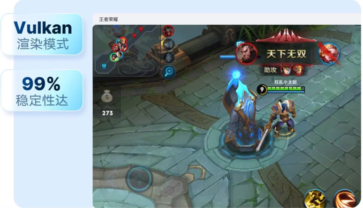 为了缓解引擎启动后CPU占用过高和游戏过程中的卡顿问题,应用宝电脑版5.0版本全新采用Vulkan渲染模式,其具备低CPU开销、多线程支持、跨平台兼容和灵活渲染管线等优势特性,可以显著降低CPU负载,实测CPU占用率降低约20%,即使玩《王者荣耀》、《和平精英PC模拟器应用宝版》、《最终幻想14:水晶世界》等大型手游时也能保持流畅不卡顿,而且引擎稳定性经过持续优化,应用稳定性达99%,为长时间游戏与应用运行提供坚实保障。
