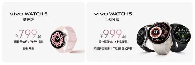vivo WATCH 5 “星纱粉”配色上市价格 799元,国补后仅需679.15元,即刻开售,eSIM版上市价格999元起,国补后仅需849.15元起,现已开启预售,将于7月2日正式开售。