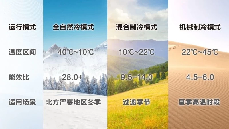 科士达全变频智慧氟泵自然冷技术根据气温条件实时计算制冷需求,切换三种运行模式,达到更优的能效比,从而显著提升节能效果。