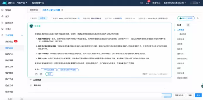 轻帆云智能ITSM依托前沿人工智能技术,基于自研的运维大语言模型CloudwiseGPT ,并融合RAG(检索增强生成)技术,深度赋能知识的消费与生产全流程。