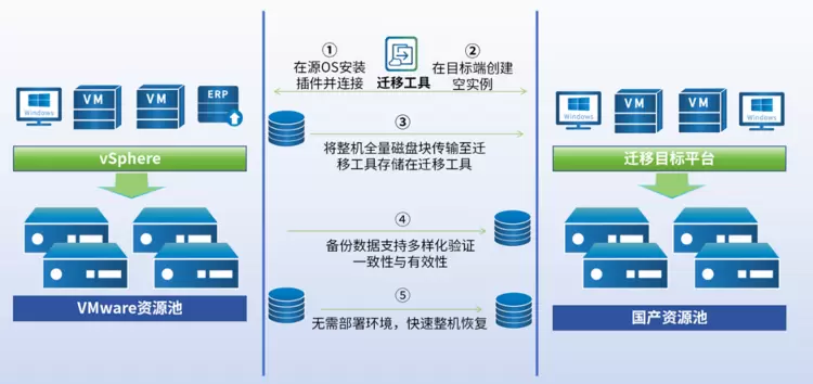 针对应用主机,使用科力锐迁移工具对接代理插件,直接将VMware源机数据整体打包复制传输到目标机,实现分钟级的业务切换。