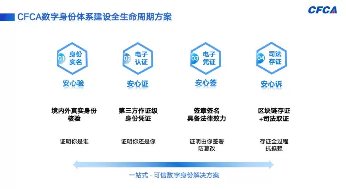 “数字身份体系建设全生命周期方案”串联起身份认证、身份凭证、电子签署、身份溯源与司法存证以及数据安全等数字金融运行的关键环节,方案不仅纵向贯穿数字身份全生命周期管理,还横向覆盖国内与国际双线数字身份认证,提供包括跨境实体身份核验、可验证的数字凭证vLEI以及司法存证在内的多类数字身份服务。