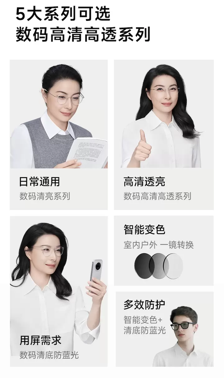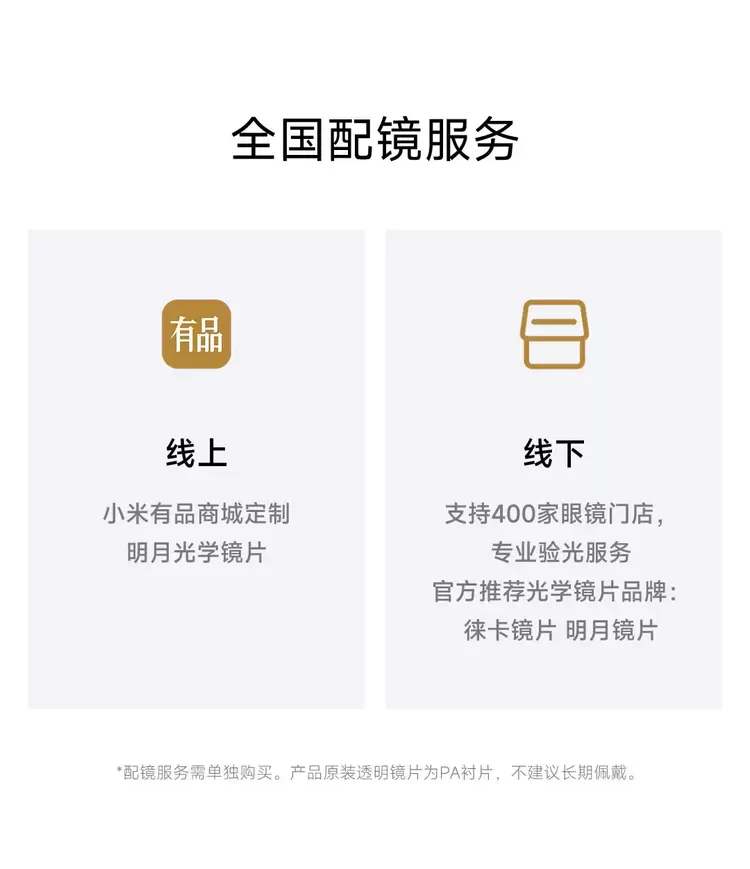 在小米AI眼镜产品详情页上显示,由明月镜片独家专供镜片,并提供米粉专属优惠价。专供的镜片系列有数码清亮、数码高清高透、清底防蓝光、智能变色、抗疲劳、渐进等系列产品,米粉可根据自身需求选择。配镜服务分线上和线下,线上小米有品商城定制明月光学镜片;线下支持400余家合作门店享受免费验光服务,购买小米AI镜架和明月专供镜片后,明月镜片将为米粉提供镜片割边、装配等一站式服务。