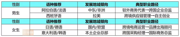 推荐综合类大学优质语言专业(如北外日语、上外西班牙语),同步规划辅修国际经济与贸易课程